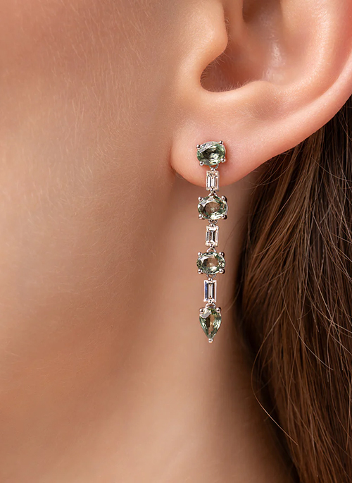 Elegant and captivating, these 14K white gold dangle earrings showcase approximately 0.61 ctw of baguette-cut diamonds (G color, VS1 clarity), offering a refined brilliance. Accentuating their allure, 3.88 ctw of vibrant oval and pear-shaped green sapphires cascade gracefully, creating a striking interplay of color and light. A sophisticated statement piece for those who appreciate timeless elegance.