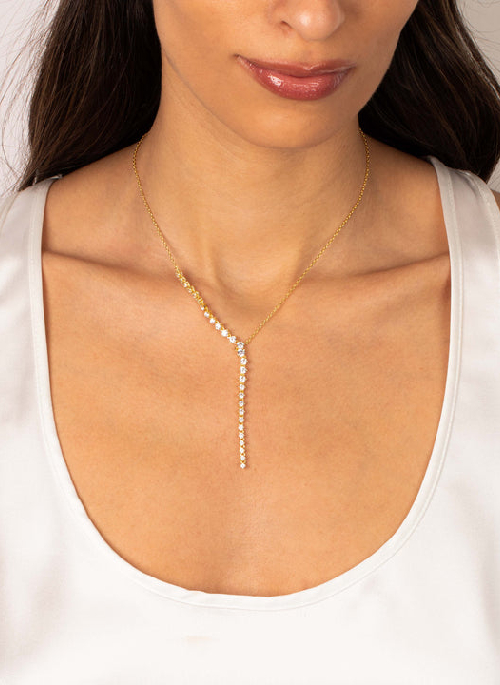 Add crisp, clean shine with the CZ Side Half Tennis Drop Lariat by Adina Eden, a minimalist Necklace with style. With graceful detail and bold tone options, this women's lariat necklace is offered in Gold and Silver. When you want your outfit to feel complete, you'll love how naturally it works into your routine while still standing out just enough. Complement this gold plated lariat necklace with pieces from our Charms & Pendants collection for a timeless, layered effect. Goes with everything and still manages to stand out.Details: