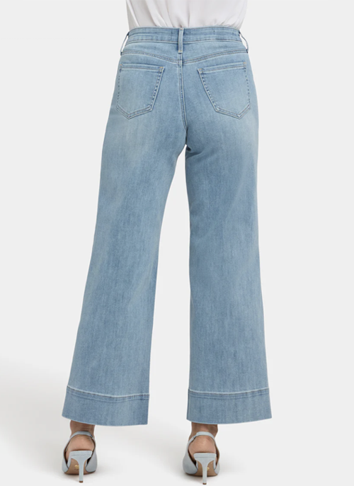 The Teresa Wide Leg Ankle Jeans with 3 Inch Hems by NYDJ have a lighthearted, on-trend silhouette that's fun to pair with heels and ankle boots. A wide leg opening adds drama, while a deep trouser hem gives this style a polished finish. Our Lift Tuck® Technology is made to help you keep your shape with a proprietary slimming panel with a patented criss-cross design that smooths and sculpts. Features five-pocket styling and a zip fly with button closure. Heritage Glow is a ’90s-inspired light indigo stone wash with vintage details and fresh highs and lows. This jean is made with earth-friendly methods that result in reduced consumption of water, chemicals and/or energy.