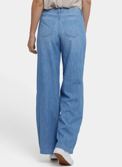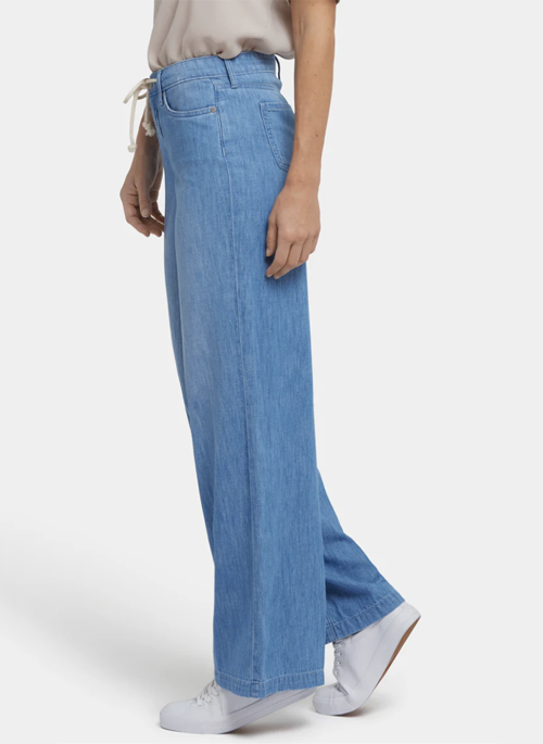 The Teresa Wide Leg Jeans with Drawstring Waist by NYDJ have a breezy, laid-back look that's super flattering. Designed to sit a little lower on the waist, they can also be worn as a high-rise silhouette pulled up to the natural waist. Lift Tuck® Technology inside smooths you out with a proprietary slimming panel featuring a patented criss-cross design. Soft lightweight denim provides a cool, comfortable feel. Finished with five-pocket styling, a zip fly with button closure and trouser hems. Riviera Sky is a vintage-tinted light blue wash with heavy fading on the front thighs and seat, blended whiskers on the front hips, distressing on the right thigh and highlighted-crease hem detail. This jean is made with earth-friendly methods that result in reduced consumption of water, chemicals and/or energy.