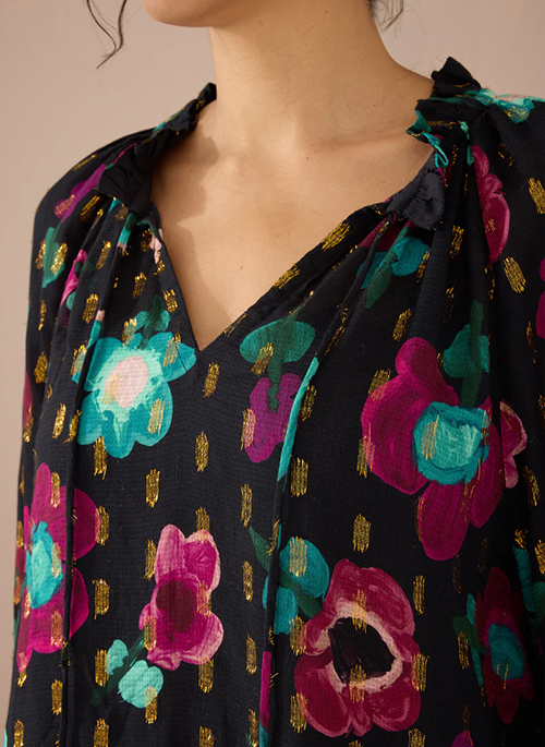 Long sleeve v-neck top that pairs great with denim or tucked into the matching Ara Skirt. Ruffle trim neck trim detail and optional adjustable neck tie.Details: