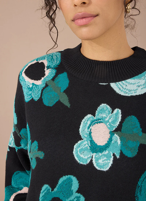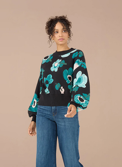 This super soft mockneck sweater features a slightly cropped body, blouson sleeves, and intricate jacquard artwork. Tapered ribbed waist. Made in India.Details: