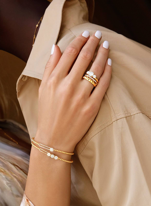 Bracelet Beads Uno uniquely displays a moving and modernly-designed floral centerpiece clenched by pure gold beads. With its distinct elegance, you can add more personality to your look. This piece is available in yellow gold, rose gold and white gold.Details: