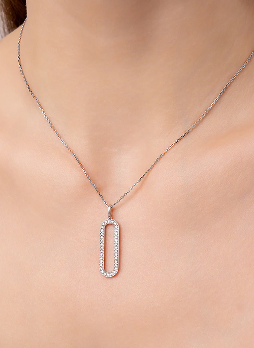 This modern paperclip-style necklace is crafted in 14K white gold and features approximately 0.40ctw of diamonds, graded G in color and SI1 in clarity. Its sleek design offers a luxurious yet understated piece perfect for any occasion.