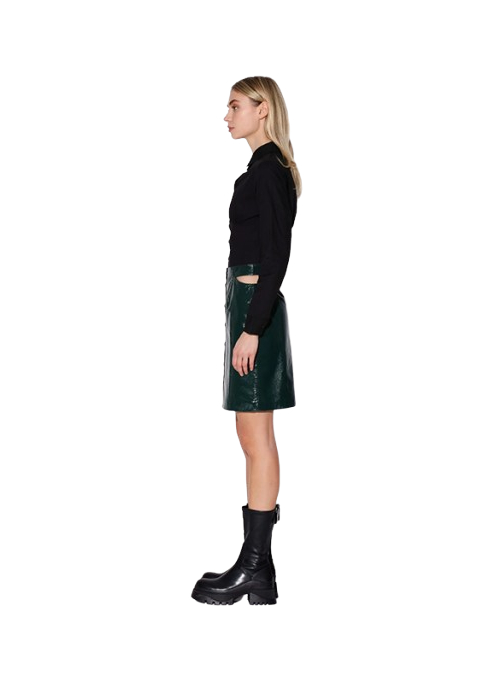 With side cut outs and button detail, the Viola Skirt is a pencil skirt with attitude! Details: Faux front buttons Exposed center back zipper closure Fitted waistband Above knee length Fully lined Shell: 100% Patent Leather Lining: 100% Polyester