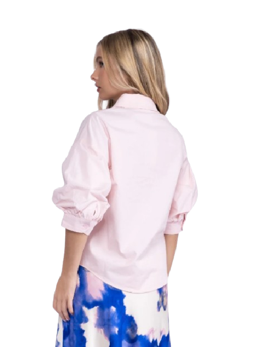 THIS CHARMING, RELAXED-FIT BUTTON-UP BLOUSE IS DESIGNED IN A BEAUTIFUL SOFT PALE PINK. IT FEATURES FASHIONABLE, VOLUMINOUS PUFFY SLEEVES AND A CLASSIC COLLAR, CREATING AN EFFORTLESS AND SWEET SILHOUETTE. CRAFTED FROM A COMFORTABLE, LIGHTWEIGHT FABRIC, THIS TOP IS PERFECT FOR ADDING A TOUCH OF GENTLE COLOR TO ANY CASUAL OR ELEVATED ENSEMBLE.