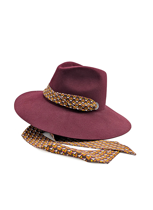 Our Morgane is a women's wide-brimmed hat in Smooth lapin felt, offering the perfect blend of elegance and technical sophistication. Made of soft, high-quality felt in the color negroamaro red, it is embellished with exclusive details such as the side icon ring and leather lace-up facca belt. Supplied with a pre-fitted strap and a safari patterned scarf, this versatile and sophisticated accessory stylishly completes any look, providing comfort and distinctive personality.Details: