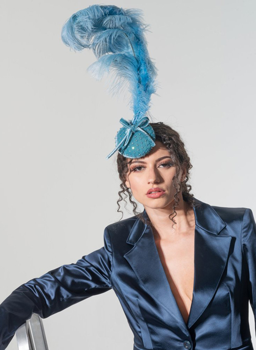 Small button headpieces featuring crystal veiling and a blue ostrich feather quill attach to the head with a black wire headband.